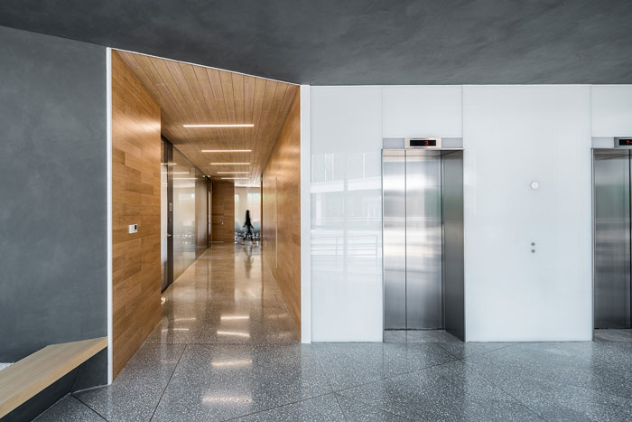 公共走道設計:用現(xiàn)代感強的深灰色作為主色調,而在會議室相對私密的走道,以木質材質為主,形成了空間的包裹感受,對不同區(qū)域空間進行區(qū)分。
