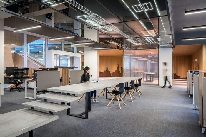 在開敞辦公區(qū)域設計中,設計將空間所必需的設備管線、橋架等隱藏在居中的吊頂內,吊頂下空間相對較低的位置,被設置為茶歇和交流區(qū)。在空間設計中以城市天際線為設計元素,同時工業(yè)化的設計,給了企業(yè)不一樣的特性。