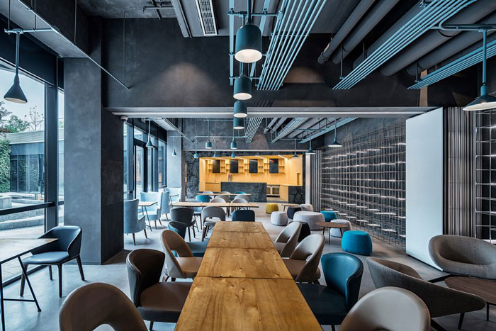 多功能咖啡館設計:是地下空間重點區(qū)域,作為員工休息放松的場所,這里定位為年輕、包容、靈活、互動,在休閑咖啡外還集合沙龍、課堂、派對為一體的集合咖啡館。