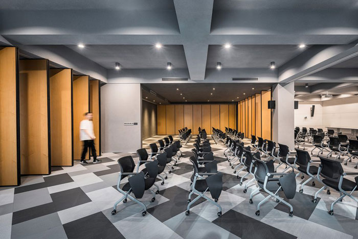 多功能廳設計:一面墻設置為白色烤漆玻璃和投影面,另外三個面和中央,通過可旋轉和平移的隔斷設置,可以根據使用行為,劃分出不同的空間狀態(tài)。