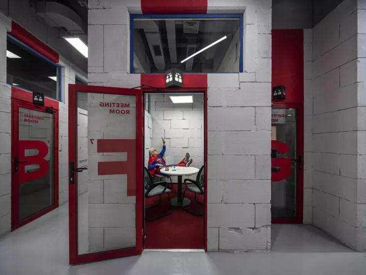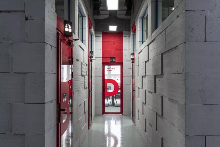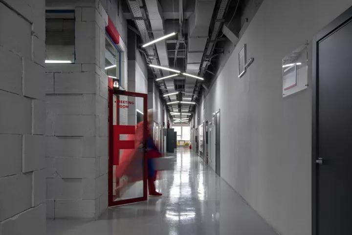 灰色環(huán)氧樹(shù)脂地坪漆、灰色的水泥墻面、灰色噴涂的頂面構(gòu)造、以及灰色砌塊墻體,整個(gè)空間統(tǒng)一在寧?kù)o的淺灰色調(diào)中,以紅色企業(yè)色來(lái)點(diǎn)亮一個(gè)個(gè)空間,賦予每個(gè)區(qū)域各自不同的劇情故事。